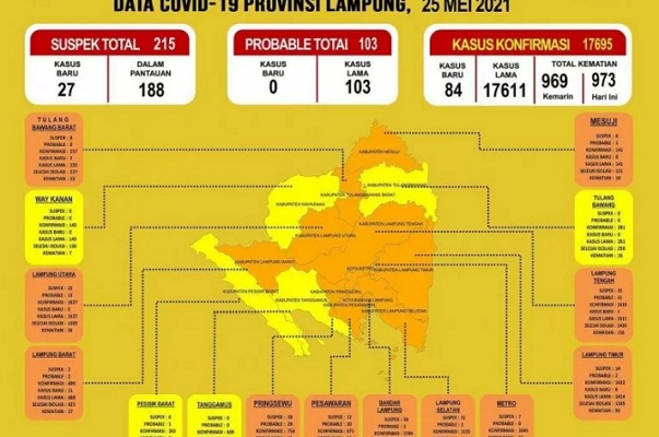Menurut catatan Bappeda terdapat 11 daerah di Lampung yang memilki warna oranye penyebaran COVID-19 yakni Kota Bandarlampung dengan 5.784 kasus, Metro 1.045 kasus, Kabupaten Lampung Timur 1.422 kasus, Lampung Utara 1.627 kasus, dan Lampung Tengah 2.618 kasus.