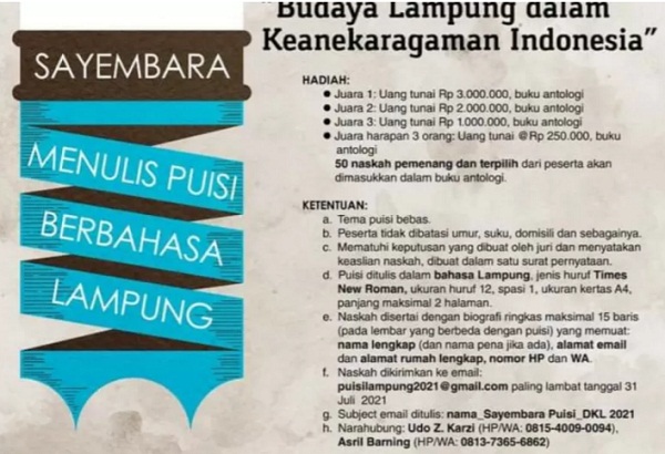 “Naskah puisi berbahasa Lampung dapat peserta kirim ke surel puisilampung2021@gmail.com sedangkan esai ke surel esai sastra2021@gmail.com paling lambat 31 Juli 2021,” kata dia. (Ant)