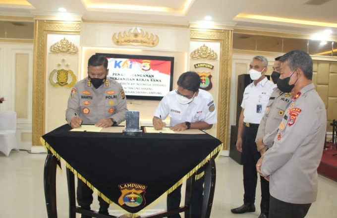 Perjanjian kerja sama tersebut ditandatangani oleh Karo Ops Polda Lampung, Kombes Pol. Wahyu Bintono Hari Bawono bersama Deputi Divre IV Tanjungkarang, Teguh Imam Santoso.